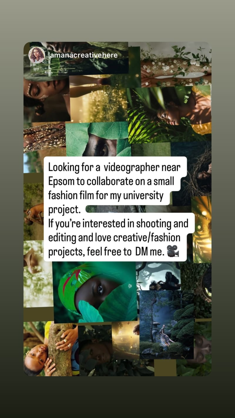 looking for a videographer near epsom to collaborate on a small fashion film for a university project. the role involves shooting and editing for a creative/fashion project.