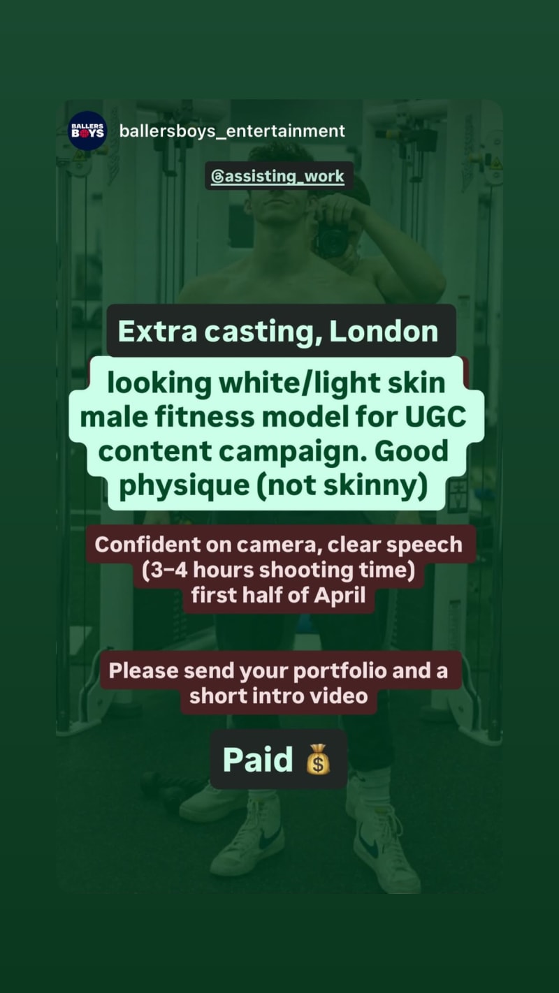 extra casting for a ugc content campaign in london, seeking a white/light skin male fitness model with a good physique, confident on camera and clear speech. shoot is 3-4 hours and applicants should send a portfolio and short intro video.